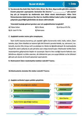 8. Tıp alanında Ebu Bekir Râzî, İbnü’n-Nefs, Biruni, İbn Sinâ, Akşemsettin gibi bilim adamları